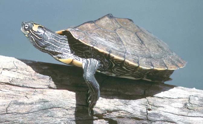 These lines often interconnect with other lines creating a map-like pattern on the shell. The head has a large yellowish crescent or blotch behind the eyes and a distinct yellow spot under the eye on the lower jaw. The highly patterned plastron of a hatchling has greenish-gray lines on a pale yellow background, but this fades to a non-descript blotchy bottom with age. Southern map turtles are strictly a large river species. They prefer moderate to fast currents. Their diet consists of insects, worms, crayfish, snails, naiads, small fish, and aquatic plants.