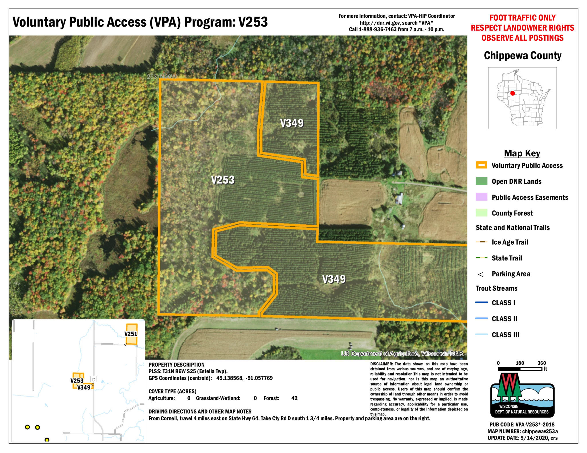 | V349 | T31N R6W S25 (Estella Twp) | 38 acres. 3 acres of grassland/wetland and 35 acres of forest. | Aerial View |