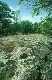 Centennial Bedrock Glade features an outstanding example of an acid bedrock glade, a rare natural community in Wisconsin. The site is situated on a prominent exposure of basalt bedrock near the Dalles of the St. Croix River within Interstate State Park. The hot, dry conditions and thin soil of the glade are habitats for a variety of plants and other organisms adapted to the harsh microclimate. They include a diverse assemblage of lichens and dry prairie plants. Also found here is the prairie fame-flower, a succulent endemic to the upper midwest. The woodland surrounding the glade openings supports stunted open-grown oaks. Centennial Bedrock Glade is owned by the DNR and was designated a State Natural Area in 2000.